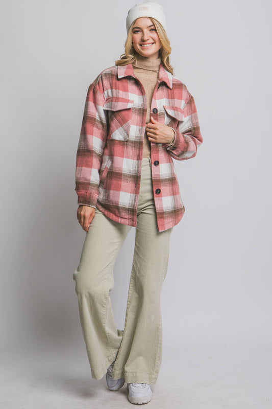 Plaid Button Up Shacket with Sherpa Lining