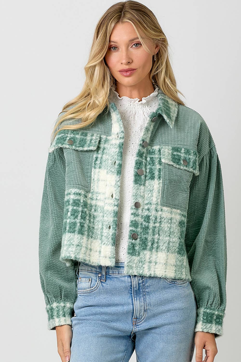 Mixed Media Shacket Button down Bust pockets Plaid print faux fur Bubble sleeves Corduroy -Model is wearing Oatmeal with 60880 dress, Soft Green with 60723 top -Model wears: S / Model height: 5` 9"
