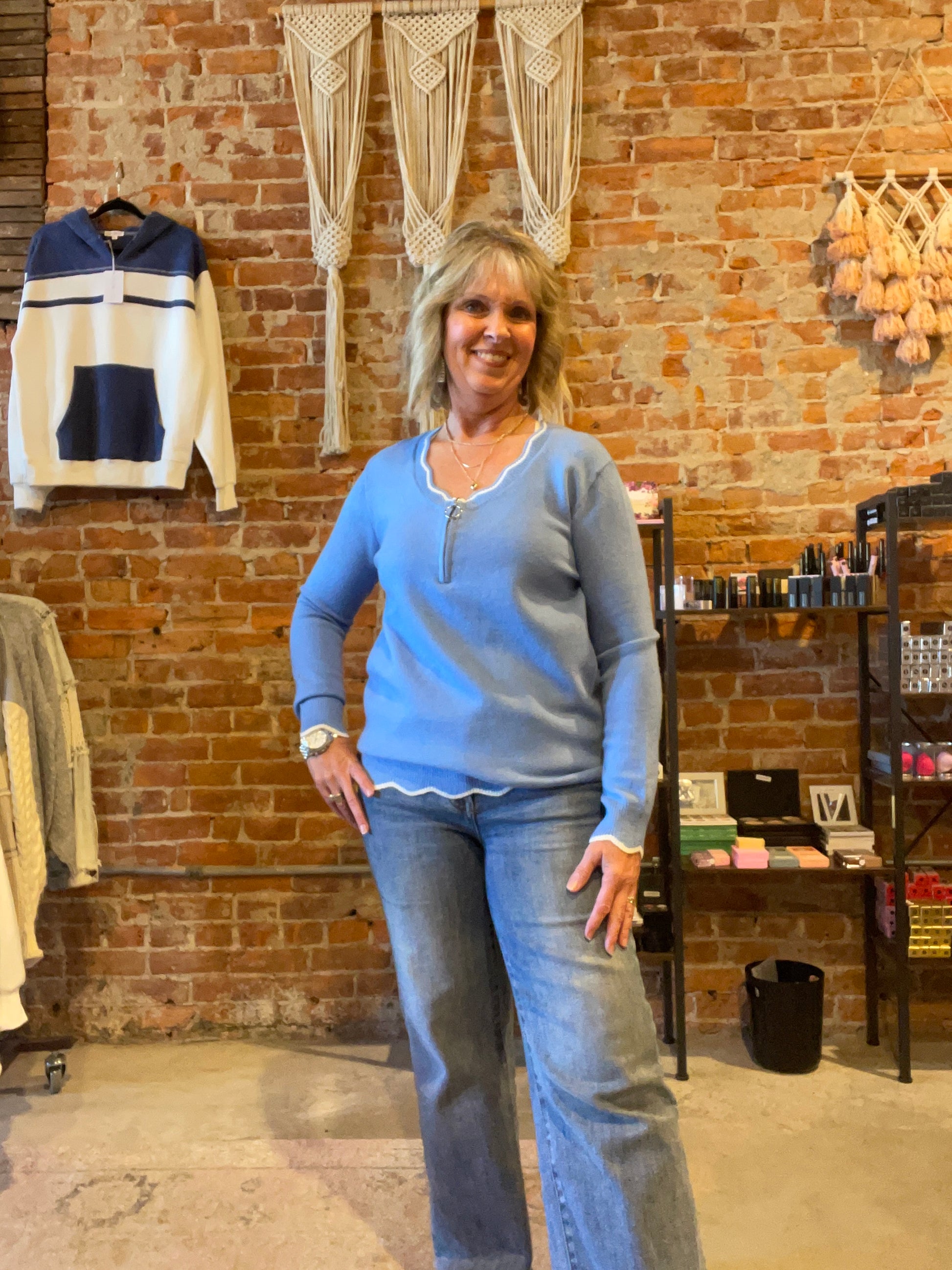 Brighten your day with the blue and white Scallop Trim Detail Sweater! Featuring charming scalloped edges and zipper neckline detail. It is so Soft, it’s perfect for adding a little fun to your everyday style. Light Weight Sweater